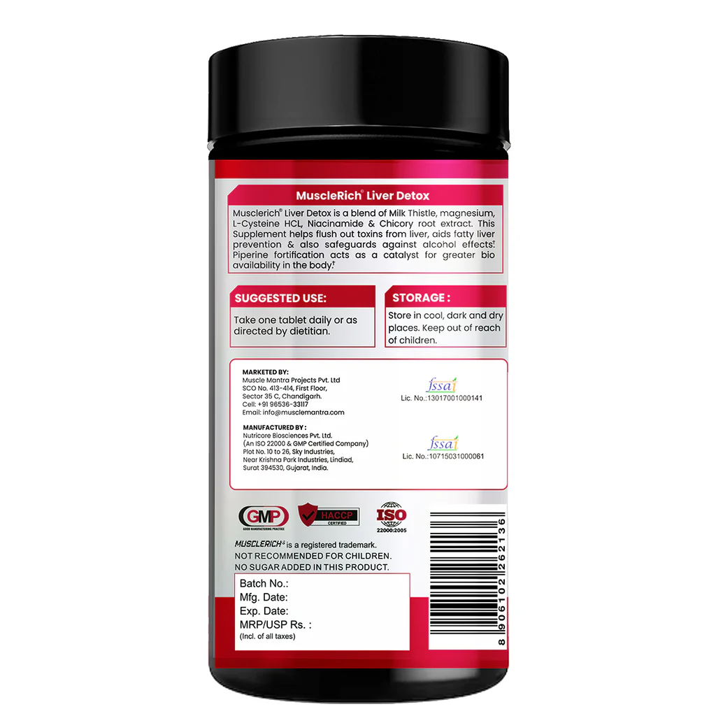MuscleRich Liver Detox is a blend of milk thistle, magnesium, L-cysteine, and chicory root extract, designed to support liver function, boost digestion, and enhance overall liver health for active adults.